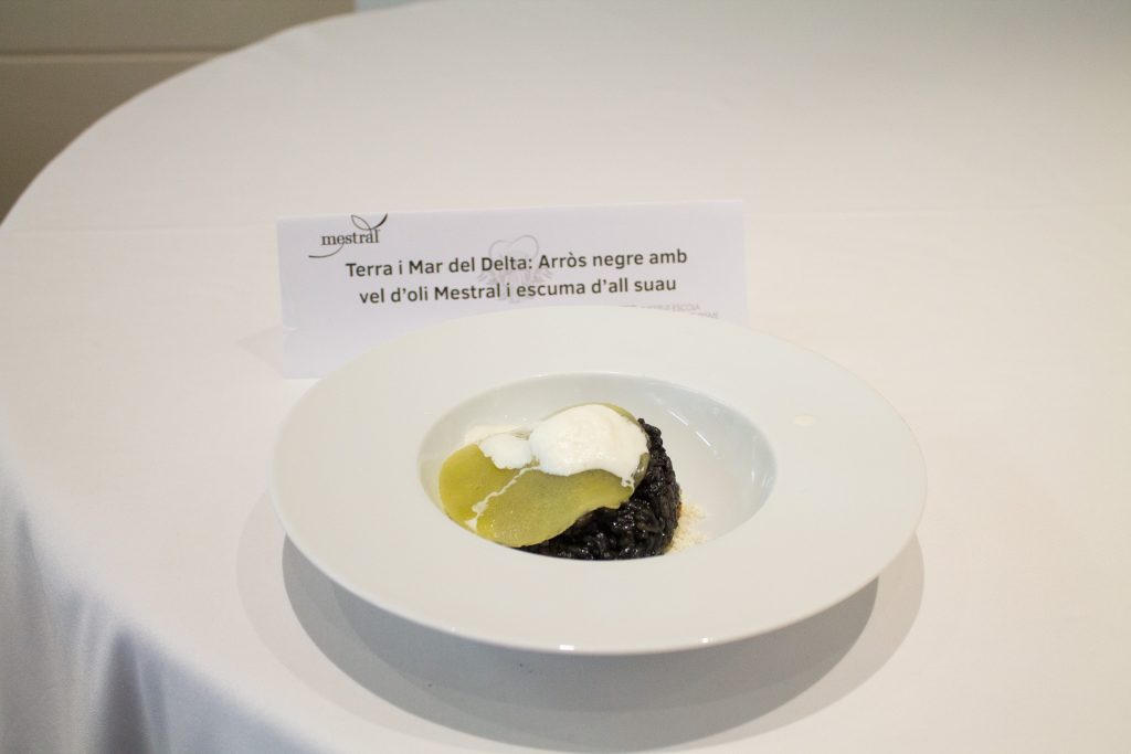 ‘L’arròs negre del Delta amb vel d’oli d’oliva verge extra Mestral i escuma d’all’, elaborat per l’alumne de 2n de Direcció de Cuina, Kai Barrera, ha estat el més valorat pel jurat «un homenatge al paisatge mediterrani on l’oli es converteix en essència i identitat» ha exposat l’alumne vencedor.