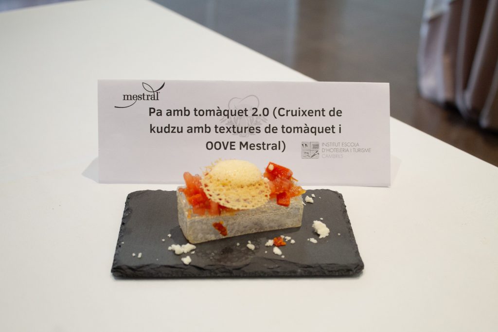 La segona posició -deliberada després d’un empat- ha estat per Erik Romero, estudiant de 2n Grau en Direcció de Cuina, amb la seva ‘Versió de pa amb tomàquet amb pa de kudzu i textures de tomàquet i oli d’oliva verge extra Mestral’ «el pa s’ha fet amb kudzu, una arrel japonesa, acompanyat d’unes textures d’oli d’oliva verge extra Mestral i acompanyat de tomàquet» ha puntualitzat el segon classificat.